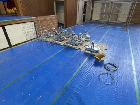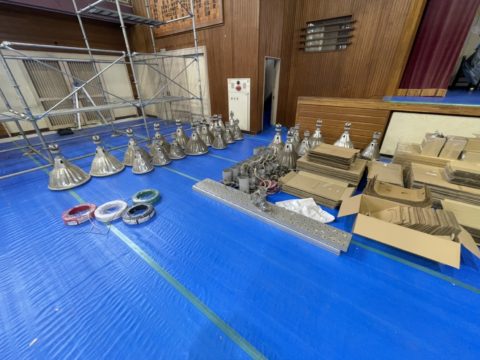埼玉県 某小学校の屋内運動場 照明器具更新工事 施工中